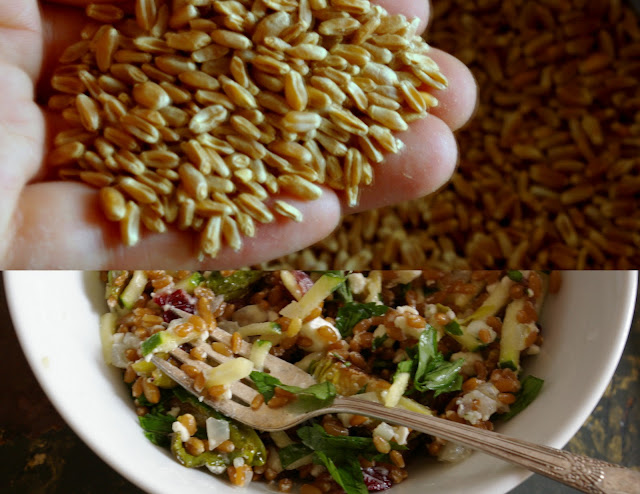 Yes, I know, you've missed me and wondered what I've been up to that could possibly be so important as to tear me away from you. Well, get over it. I'm not telling (cough, napping). All that matters is I'm back and I come bearing healthy, wintery, salady treats. Exactly what you've been craving, I know! I've had a hankering for wheat berries lately...they have a great nutty flavor and a satisfying crunch that makes me feel warm and toasty, even when served room temperature. Not to mention that for you health conscious folks out there, they're a treasure trove of protein, fiber and iron. To my shock and dismay, my enthused references to wheat berries -- since apparently in my deranged mind, they make for a great cocktail convo -- have met with a fair amount of confusion from some of my nearest and dearest. So if you're someone who has never heard of them, or someone who has had an unpleasant encounter, I beg of you, do try again.
