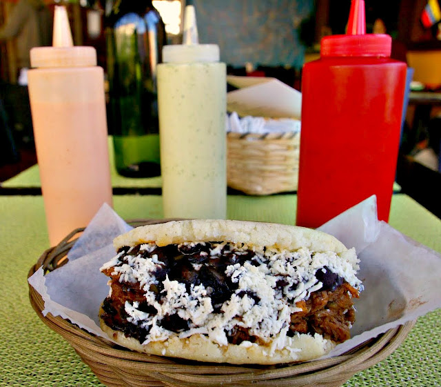If you've never had the good fortune to try an arepa, the Arepera Guacuco Restaurant is undoubtedly the place to start (and finish). Arepas are a traditional Venezuelan dish, consisting of a cornmeal patty stuffed to the brim with savory ingredients ranging from seafood, to chorizo, to my personal favorite, the Arepa a Pabellón. The latter features a decadent serving of tender shredded beef, marinated with onions and peppers in a fiery tomato sauce. Nestled in the beef are black beans and deep fried sweet plantains, topped off with a crumbled queso año. It's a heavenly blend of flavors with a perfect balance of spicy, sweet and salty that makes me crave this hearty sandwich pretty much all the time. Because the arepa is grilled in oil and then baked before being sliced open and stuffed, it has a lovely golden-brown crispness on the outside that just barely manages to contain its succulent interior (and for those on the lookout, the patty is 100% gluten free). On my server's recommendation, I smothered the whole thing in their delicious house sauces -- the salsa rosada (ketchup, mayonnaise, mustard), the picante nulo (jalapenos, green tomatillos), and the guasacaca (herbs, vegetables) -- each containing some of owner Leonardo Molina's carefully guarded secret ingredients from recipes brought all the way from his home town of Guacuco, Venezuela. Pair your arepa with the restaurant's aptly named "amazing coconut milk shake" for a delightfully depraved meal.